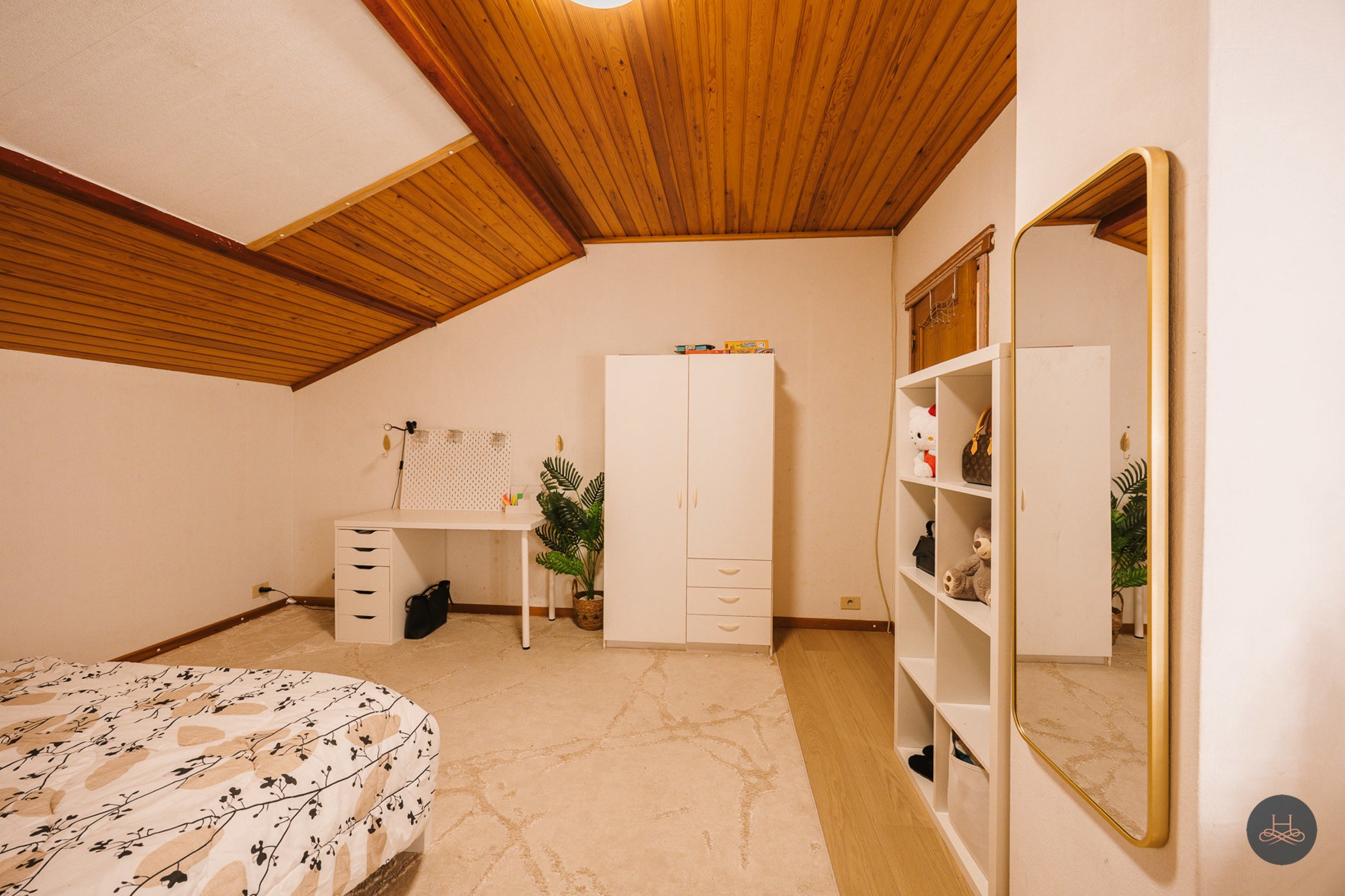 - Verdieping: twee ruime slaapkamers, alsook een vierde slaapkamer met bijkeuken. Van hieruit heeft u toegang tot het met kunstgras belegde terras. Hier kan u in alle rust genieten van het zicht op de tuin.
